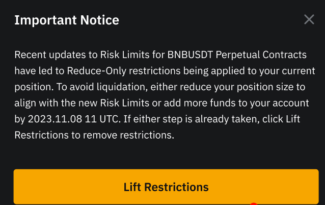 Si el sistema considera que el riesgo posterior al ajuste es mayor, los nuevos parámetros de riesgo no se aplicarán a tu cuenta inmediatamente. En este caso, se dará un periodo de amortiguación de 10 días, durante el cual solo podrás hacer órdenes de tipo sólo-reducir o cancelar órdenes para el par de trading específico. No podrás hacer nuevas órdenes de mercado ni órdenes límite que aumentarían el tamaño de tu posición (las órdenes condicionales no se verán afectadas) hasta que añadas más margen a tu cuenta o posición para cumplir el nuevo nivel de límite de riesgo. Se mantendrán todas las órdenes existentes.