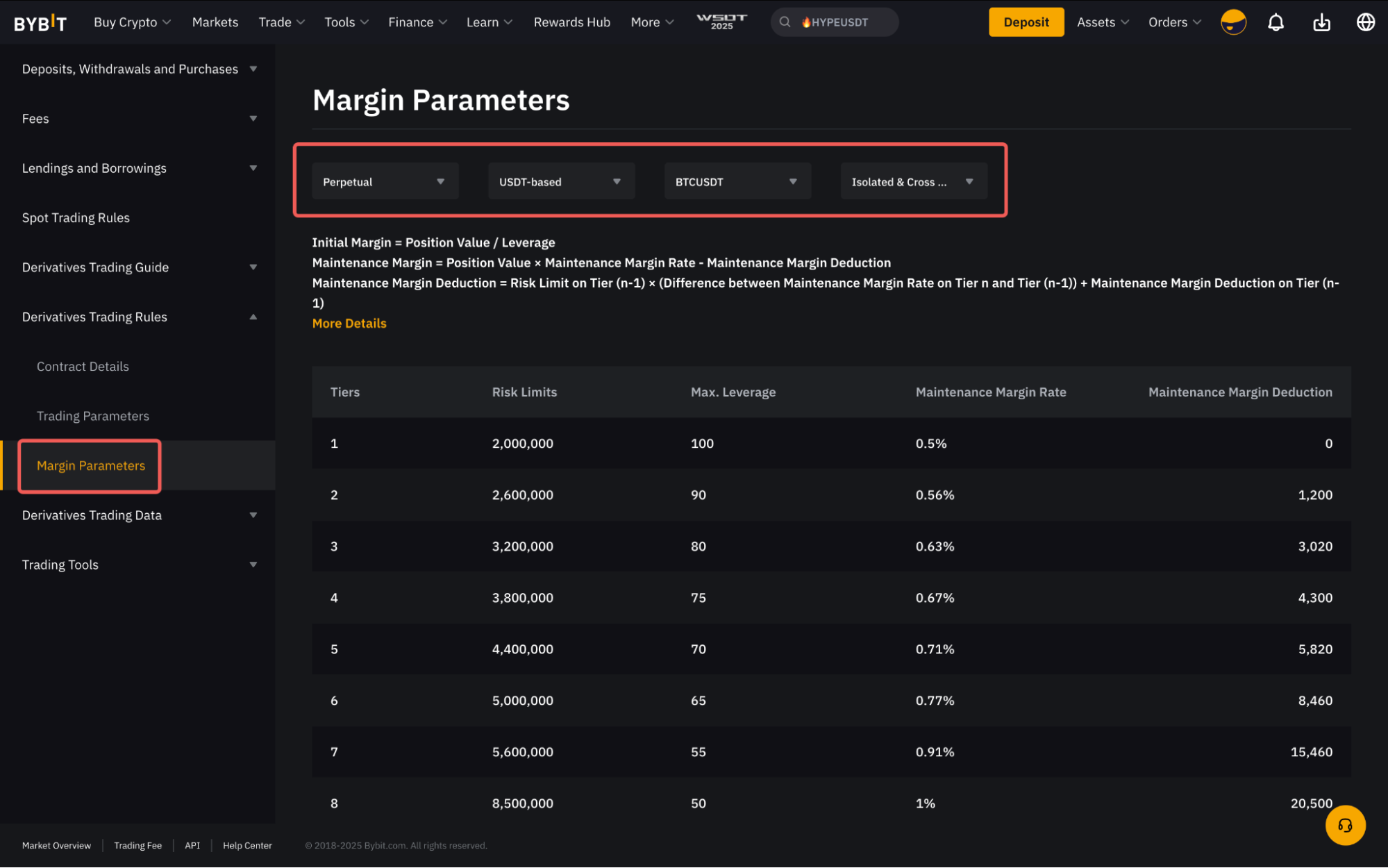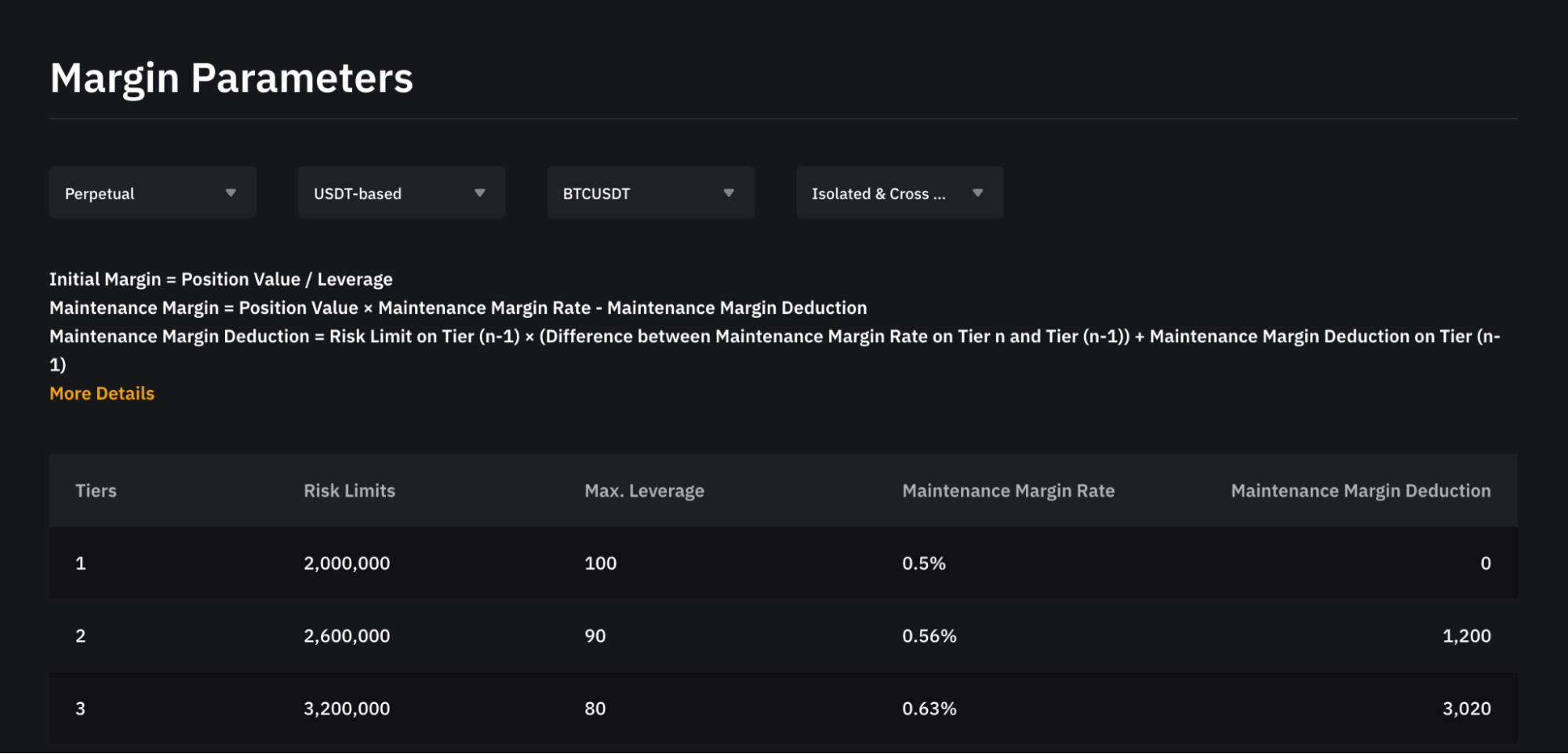 Para ver la información del límite de riesgo para todos los pares de trading, puedes hacer clic en Info derivados → Reglas de trading de derivados → Datos de margen o visitar esta página