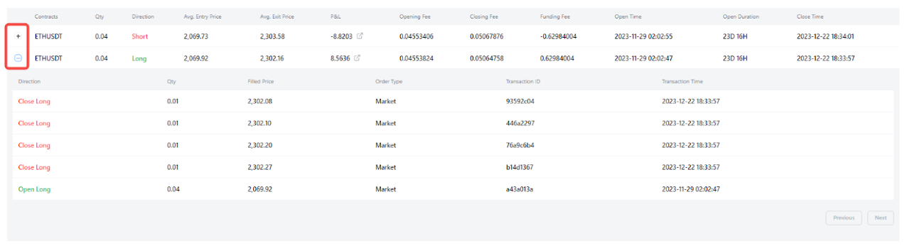 2) Para Órdenes Cerradas, muestra las PyG realizadas de cada transacción cerrada, incluyendo la transacción proporcional y las comisiones de financiación si se trata de una posición parcialmente cerrada.
