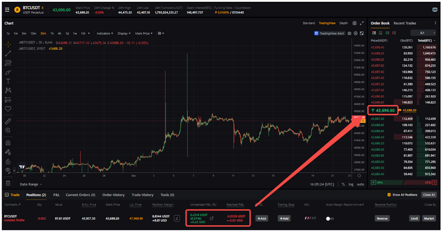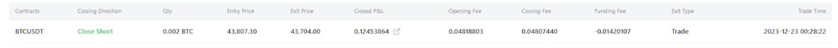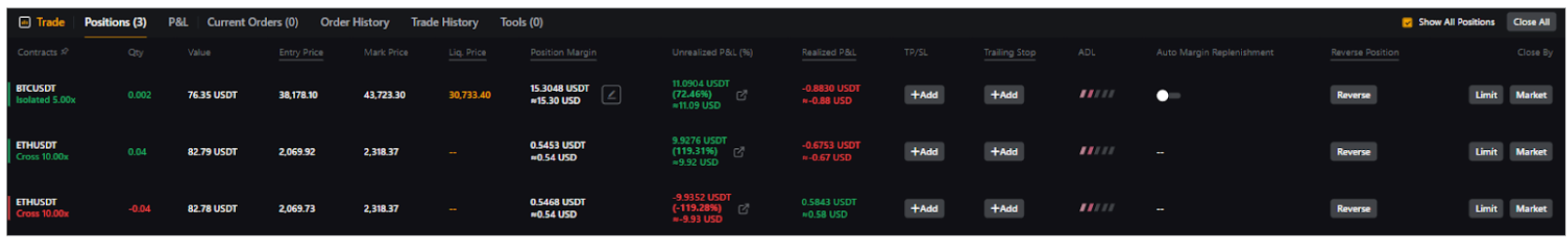 Ganancias y pérdidas no realizadas = 0,2214 USDT (Las ganancias y pérdidas no realizadas positivas de la imagen anterior muestran hasta 4 decimales)