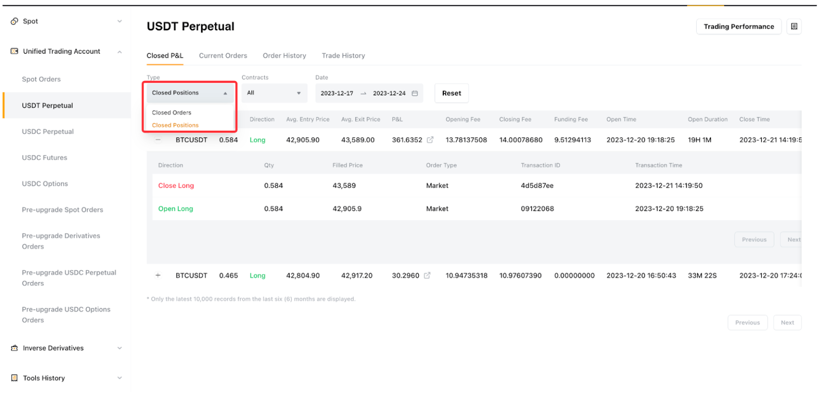 Se puede acceder a las PyG cerradas de cada posición haciendo clic en Órdenes → Órdenes de derivados u órdenes de negociación unificadas → PyG cerradas y tiene las siguientes características clave.