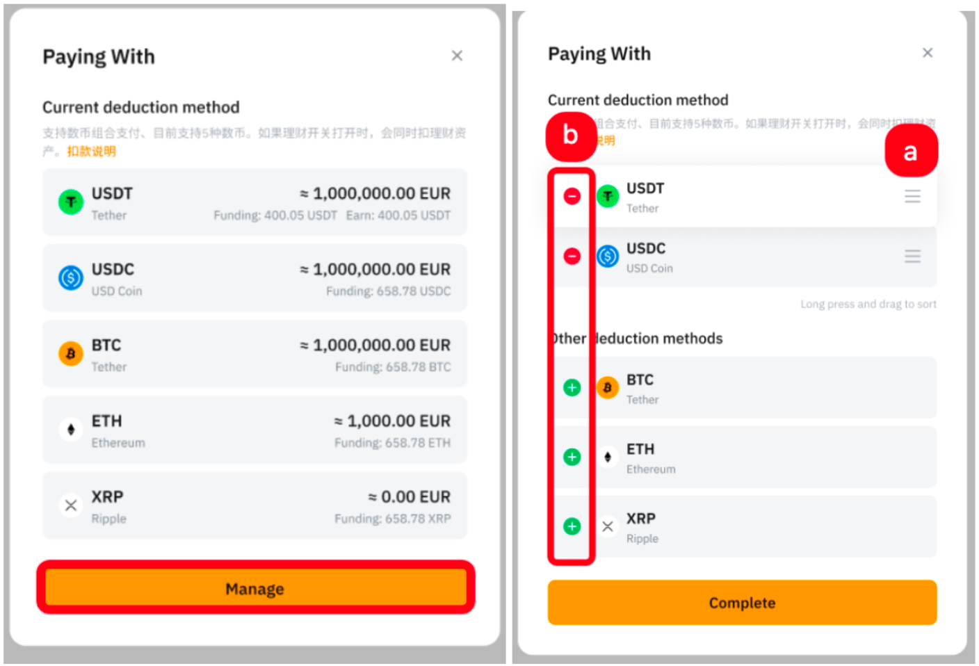 Натисніть Оплатити за, і вам буде запропоновано перейти до вікна управління. Потім ви можете (a) керувати ордером, перетягуючи його вгору та вниз, або (b) додавати та видаляти монети зі списку. Після завершення ви можете здійснити покупку за допомогою картки Bybit, і система дотримуватиметься встановленого вами пріоритету оплати.